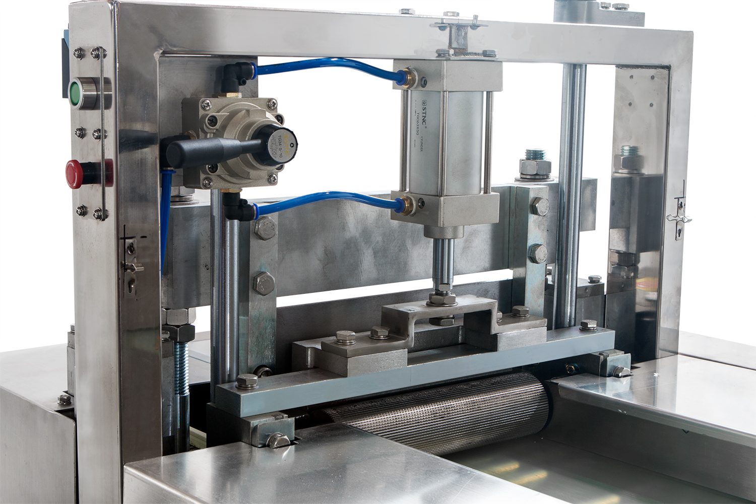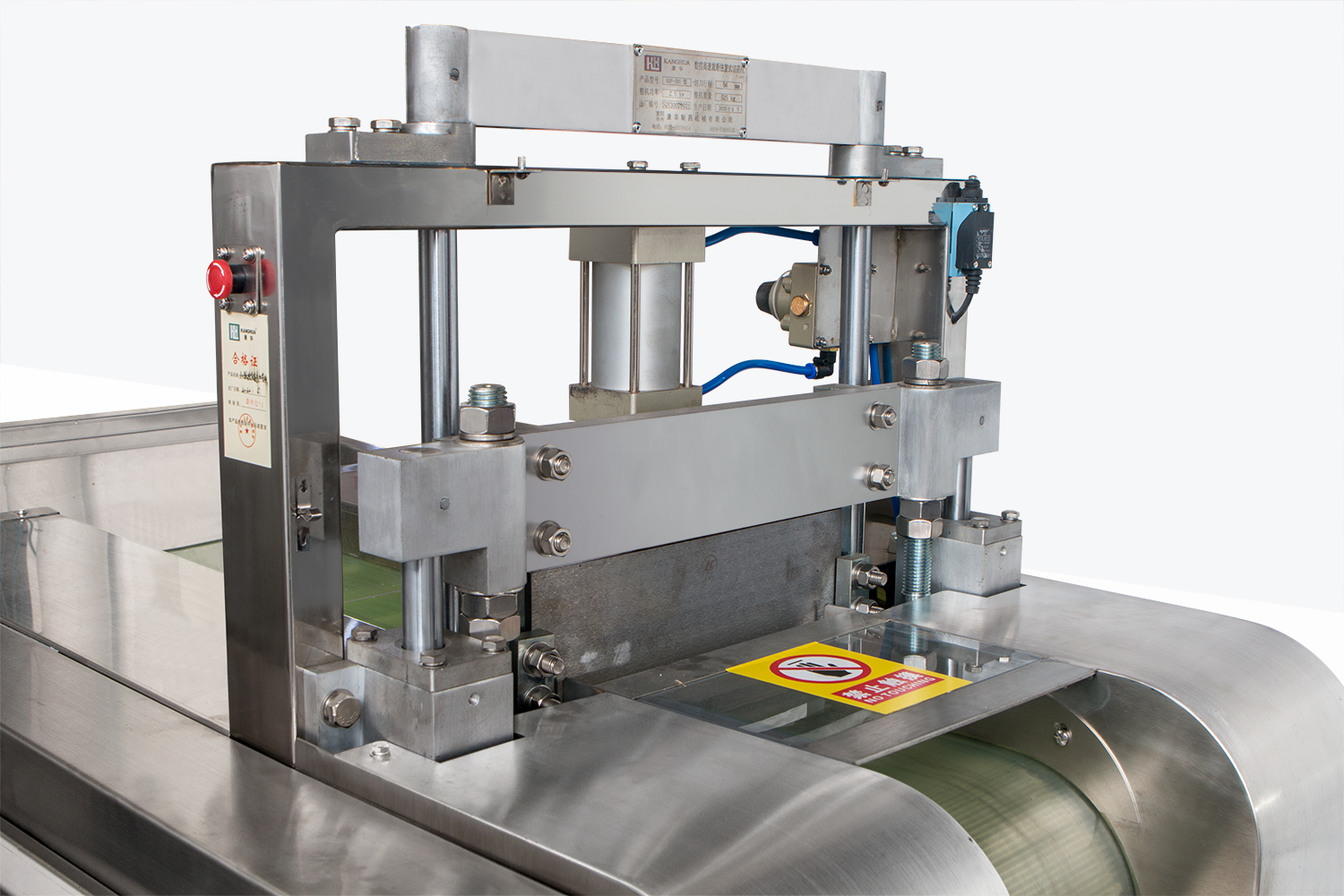 特制的輸送帶和壓料機構(gòu)將物料按設(shè)定的長度,作步進平行移動,垂直上下往復運動的切刀機構(gòu)直接在輸送帶上切斷物料。
